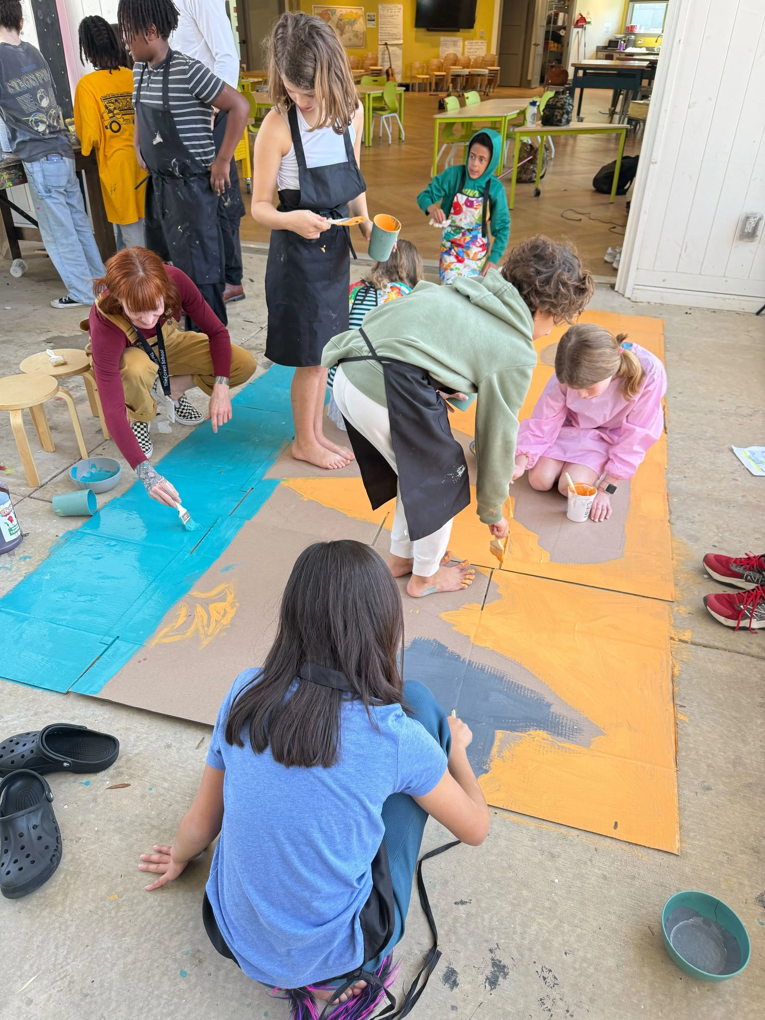 The designs were created by Dottie and Mika, and the entire Studio joined in to bring them to life with paint. Our art Guide, Ms. Amanda, led the effort, helping to sketch and scale the original drawings up to full size on the large panels. Watching the Studio collaborate on something this big was exciting—brushes moving, colors mixing, and ideas coming together into a shared visual world.